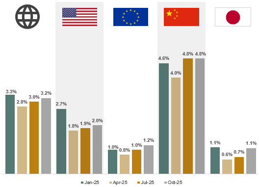 • Global GDP growth outlook for 2025 improved for the second straight quarter after downward revisions in April; while still marginally below prior year expectations, global growth outlook rose to 3.2%